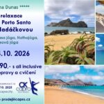 Autor: adminRezervace Podzim v jemnosti? Sobotní odpoledne jen pro vás? S pohybem a v klidu zároveň? Zveme vás s velkou radostí v sobotu 8.11. 2025 na výjimečné jógové setkání s názvem „PODZIMNÍ JEMNOST“ Osobní pozvánka od skvělé Sáry Mei, která vás provede krásným pozimním odpolednem:“ Přijďte se uvolnit do netlačení a jemnosti – pohybu i zastavení.Přijďte si - Jóga a relax s Mirkou Hadáčkovou na portugalském ostrůvku Porto Santo 27.9.-4.10.2026